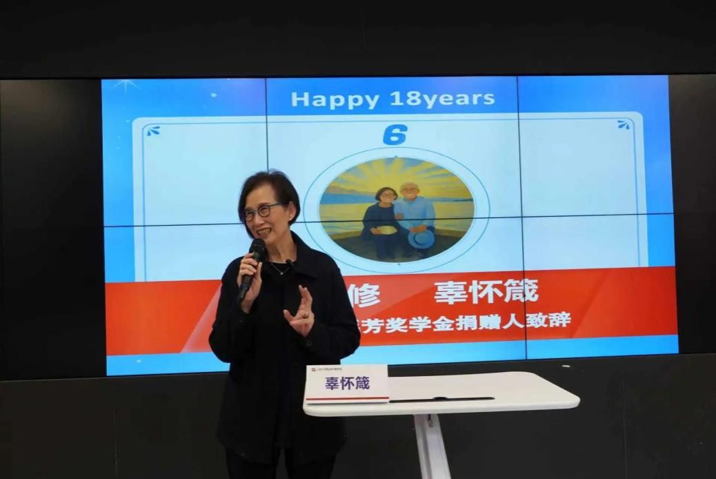 新闻传播学院党委书记王晴川向基金会十八年来的初心坚守与慷慨支持致以诚挚的感谢。王晴川书记希望同学们能铭记这份关爱与温暖,并勉励大家要常怀感恩之心,在奋进中锤炼品格,在拼搏中磨砺自我,发扬上大“自强不息、道济天下”的校训精神。