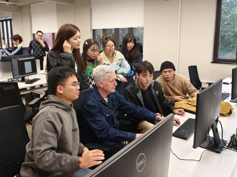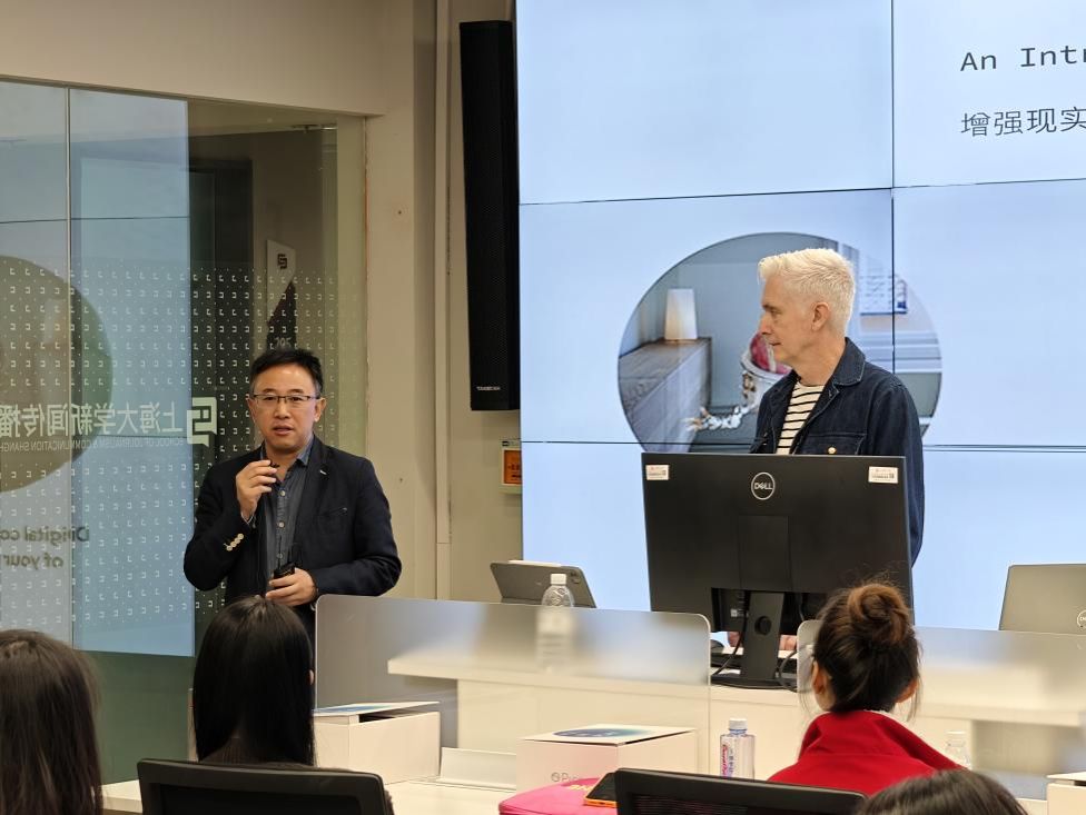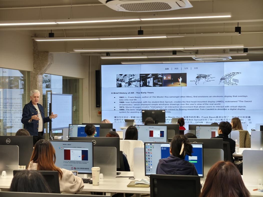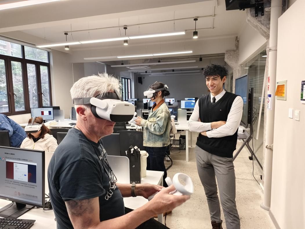 2025年11月4日至5日,由上海大学新闻传播学院与悉尼科技大学传播学院联合主办、上海大学新闻传播学院实验中心承办的“增强现实、全景影像与虚拟现实(AR, 360 Video and VR)”创作工坊在我院实验中心成功举办。本次活动邀请到了悉尼科技大学传播学院的Gregory Ferris副教授担任主讲教师,他为学生们带来了一场沉浸式媒体创作的技术盛宴。Gregory Ferris副教授长期深耕互动媒体、虚拟现实等前沿领域,自1980年代起便致力于实验性媒体创作。他曾作为摄影设计与后期制作总监,参与创作了世界上首部全景互动叙事电影《窃听》,并在开创性VR项目“对话”中担任核心创作角色,该项目于2004年在澳大利亚Powerhouse博物馆展出,是全球早期360度立体叙事的典范之作。