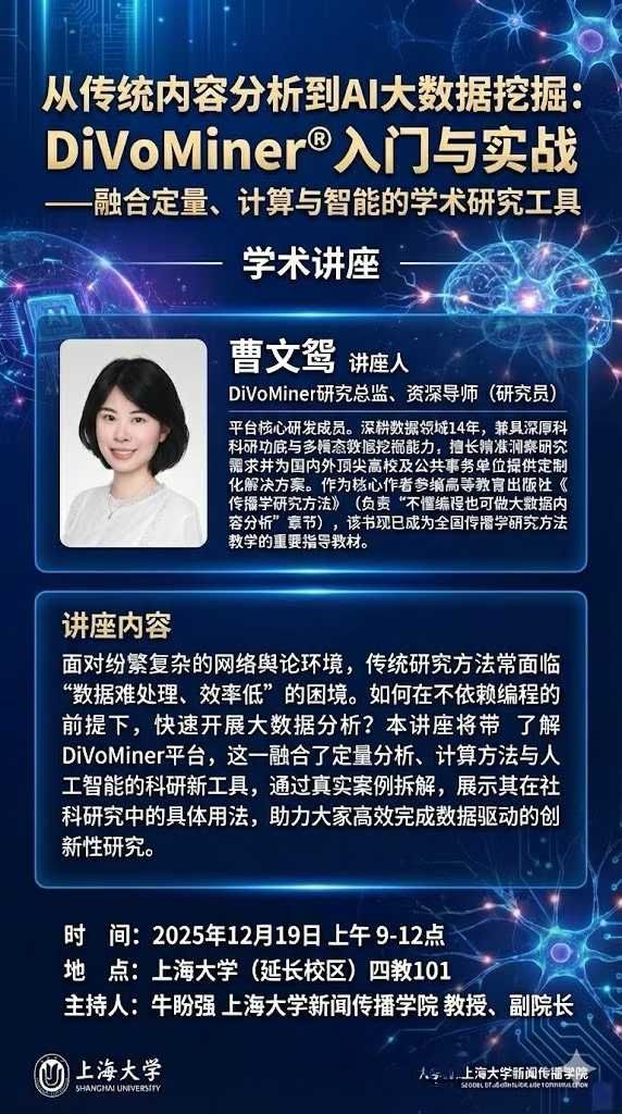 2025年12月19日,上海大学新闻传播学院在延长校区举办了题为《从传统内容分析到AI大数据挖掘:DiVoMiner入门与实战》的学术讲座。本次讲座由上海大学新闻传播学院副院长牛盼强教授主持,DiVoMiner研究总监、资深导师曹文鸳担任主讲。