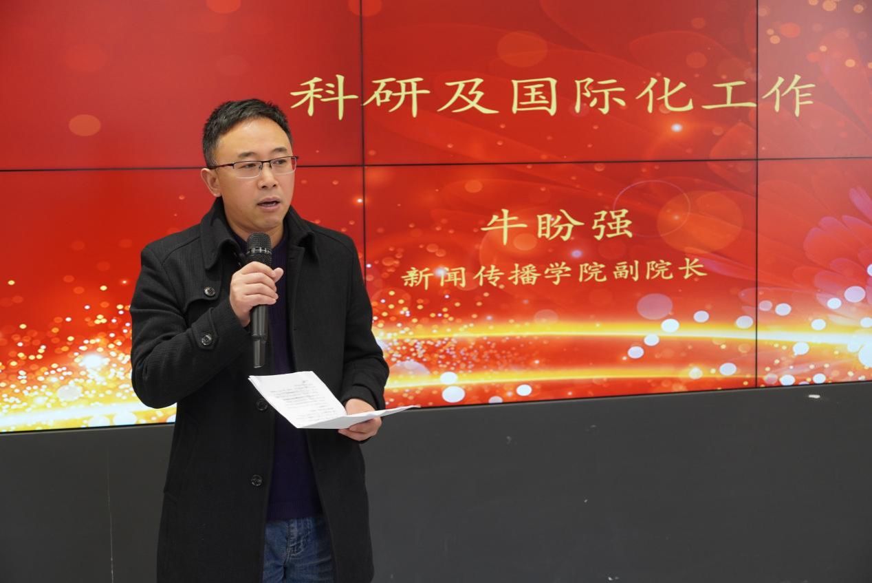 副院长牛盼强从有组织科研、项目申请、平台建设、智能传播期刊建设、学院激励计划、国际新闻传播教育联盟提质增效等方面部署了科研和国际化方面的年度重点工作。