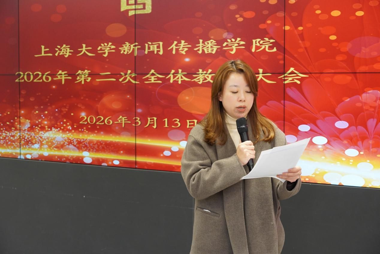 3月13日下午,上海大学新闻传播学院2026年第二次全体教师大会在上海智能媒体传播创新实验中心104室举行。学院党政领导班子成员及全体教师参加会议,会议由学院党委副书记、副院长王智君主持。