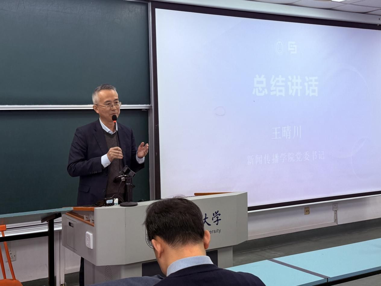 活动最后,王晴川书记在总结讲话中强调,新闻传播学院办学特色鲜明、优势显著,可归结为 “体制双共建、育人重实践、紧跟智媒体、突出马新观”。他指出,学院资源丰富、前景广阔、未来可期,各类实践项目、品牌活动亮点纷呈,积极为同学们搭建优质成长平台。他热忱邀请在场同学加入这个充满活力的大家庭,在未来的学习生活中共同 “追逐光、靠近光、成为光、散发光”。